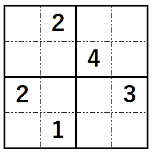 例えば下記のような数独の問題があったとしますね。この問題だと縦横のマス数は4なので、1~4の数字を入れることになります。
