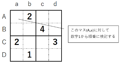 例えば上の問題、左上のマスを(A,a)と表すとします。このマスに、まず数字1を入れてみましょう。同じ行・列・2×2のブロックに数字1はないので、いったんこのマスに数字1を仮決めします。(仮決め=正しいと仮定する)