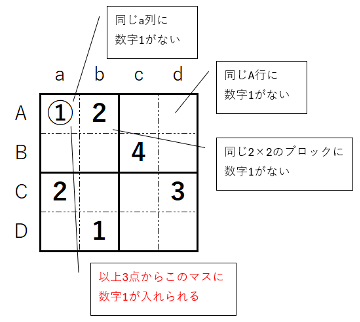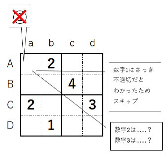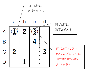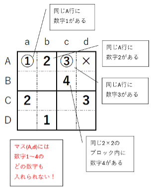 でも、このまま進めると上の問題は行き詰まることにお気づきでしょうか。次の(A,d)を見ると、同じ行に数字1~3があり、2×2の同じブロック内(B,c)にも数字4があります。つまりこのマスに入れられる数字はないんです。